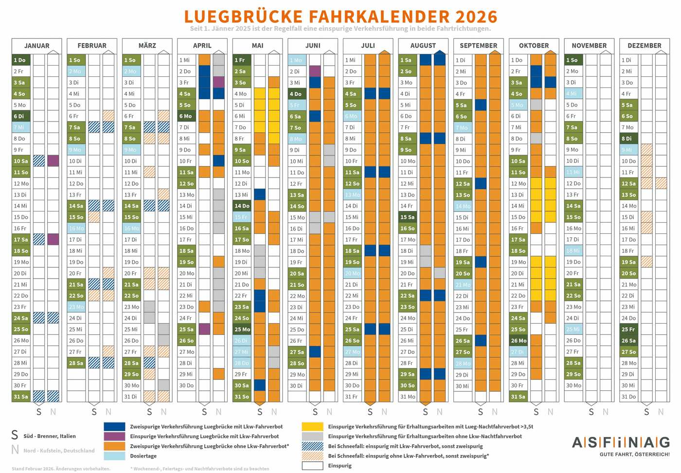 Um die Planung von Fahrten auf der Brennerroute zu erleichtern, hat die ASFINAG in enger Zusammenarbeit mit den Tiroler und nationalen Behörden einen detaillierten Fahrplan erstellt, in dem ein- und zweispurige Transittage sowie Transitverbote für schwere Fahrzeuge angegeben sind.